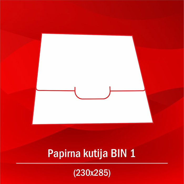 BIN kutija namijenjena je za pakovanje marama, šalova i sličnih odjevnih predmeta. Štancovana kutija u obliku kocke sa preklopnim zatvaranjem. Izrađuje se od bindakot kartona 250-350 gr/m2 u boji. Osnovna štampa u jednoj boji.