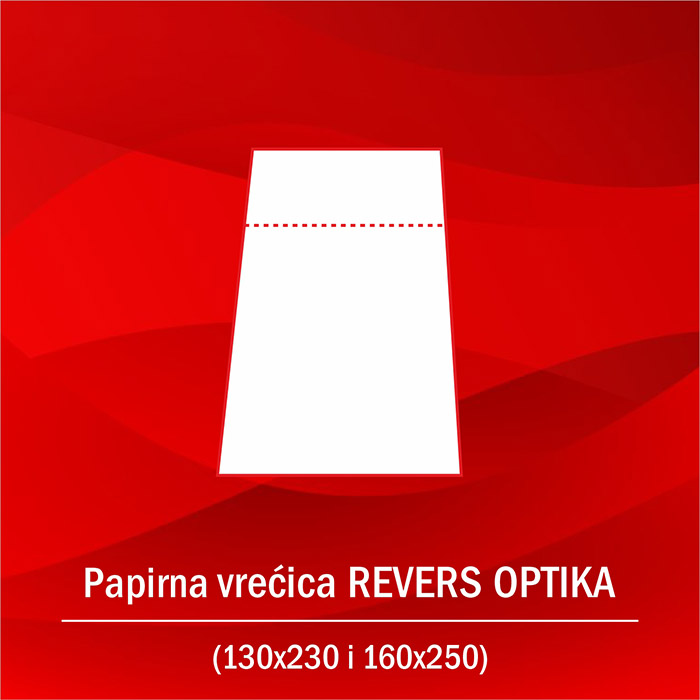 Vrećica revers optika. Štancovana pravougaonik vrećica sa perforacijom za otkidanje etikete mušteriji. Izrađena od offset papira 140 gr/m2 u bijeloj boji, osnovna štampa u jednoj boji ili color štampa.